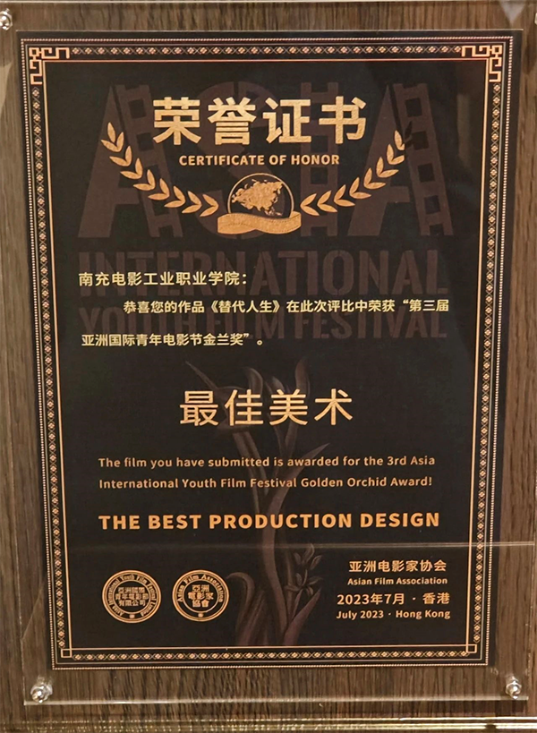 由南充电影工业职业学院创作的电影短片《替代人生》在3500部参赛影片中脱颖而出,斩获“最佳美术奖”荣誉,学校副校长何卫东和本片执行导演程琪茗步入红毯、登上舞台、捧回了“金兰奖”奖杯!