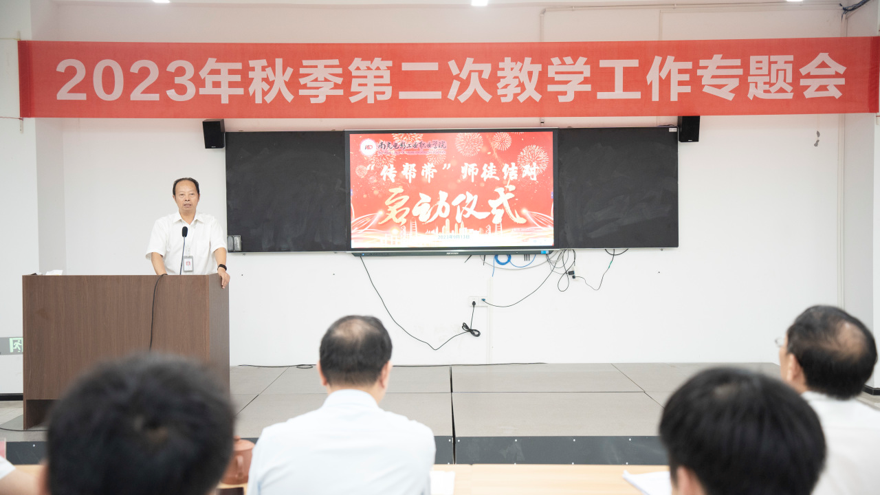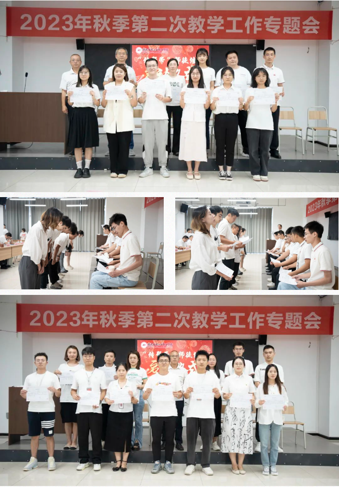 教务处副处长黄明清对教师前五周教案准备的检查情况做了通报,整体情况达到预期。但教案书写中还存在些许不足,建议各二级学院引起重视,并加强编写教案规范性的培训和督导,培养教师树立规范书写文书的意识。 科研处长阳彦雄教授围绕本次编写课程标准的目的及意义及编写方法,阐述了此项工作的重要性、必要性和严肃性,布置了编写的课程标准的相关工作。 本次会议在王甫茂副校长的主持下,隆重举行了“传帮带”师徒结对启动仪式,新入职的“徒弟”们依次上台向“师父”敬茶行拜师礼,师徒间交换“拜师帖”和“收徒帖”,并合影留念。会上“师父”“徒弟”的代表分别发表感言、相互都作出了郑重承诺。此活动仪式感强、严肃庄重,既弘扬了中华传统文化,又让大家明确了肩负的使命。 最后,学校党委书记陈永龙就人才培养工作水平评估指标体系进行了剖析,强调了专业培养方案、课程标准、教案等教学资料的重要性。他指出学校要培养出一大批有理想信念、有道德情操、有扎实学识、有仁爱之心的“四有”好老师,学校才能培养出更多的符合社会需求的人才。 此次会议通过对相关制度的解读和提出要求,有助于进一步规范教学管理,促进管理水平的提升;“老带新”活动的开启,有助于新入职教师的教育教学能力较快提高,有利于学校师资队伍整体水平的提高,从而保障人才培养的质量。