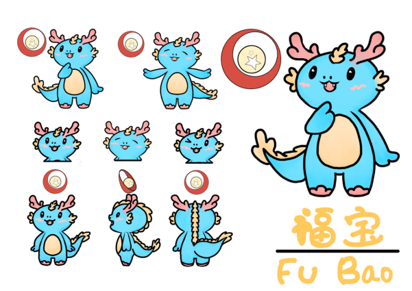 龙是中华民族的象征也是我国神话传说里的点睛之笔,自古就有“青龙纳福”之意,所以使用了小龙人作为主体,将人与青龙结合。为青龙设计了可爱的五官,代表着可爱、纯洁。龙珠造型参考了学校星光大道的雕塑,象征着学校发光发热温暖着学生。