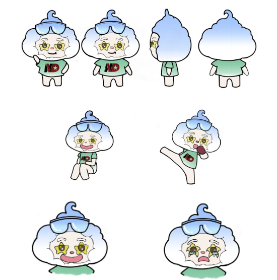 使用代表着“吉祥”的云朵作为主体,头部的造型和颜色灵感来源于“五彩祥云”;衣服造型参考的鲤鱼,希望我们南电学子向鲤鱼的寓意一样青云得志、飞黄腾达等;头上的角、围脖、鞋的颜色使用的水的颜色,灵感来源于学校坐落在嘉陵江旁,希望我们南电学子意志坚强,生生不息。