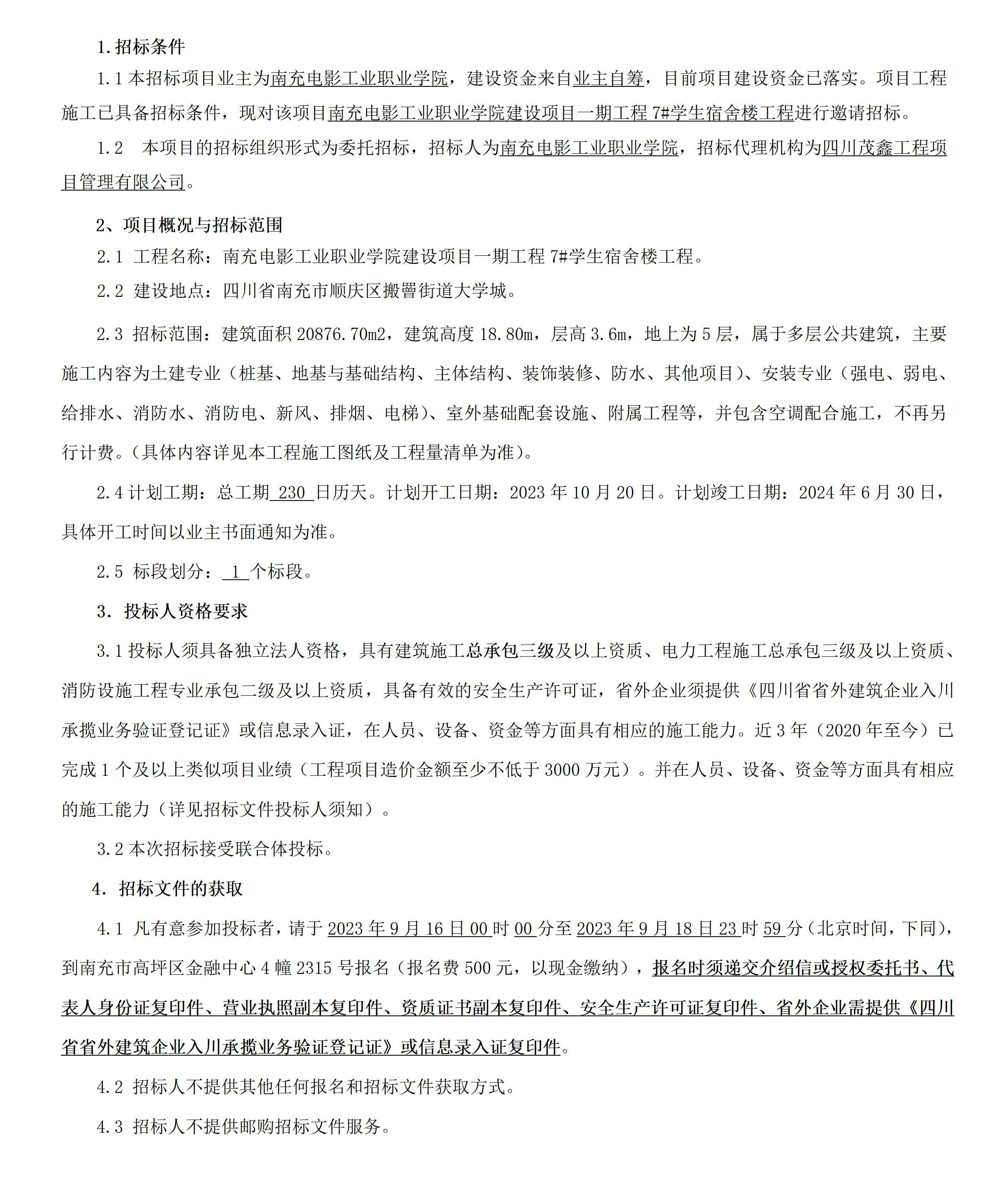 南充电影工业职业学院建设项目一期工程7#学生宿舍楼工程施工招标公告