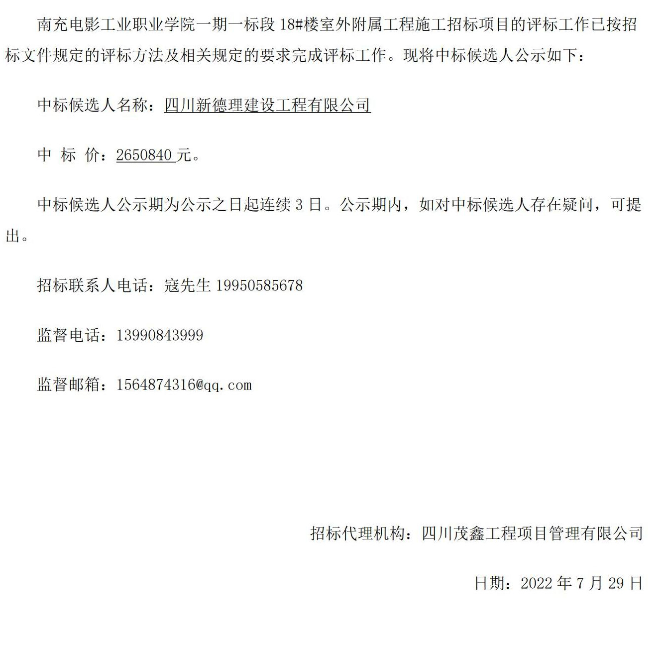南充电影工业职业学院一期一标段18#楼室外附属 工程中标公示