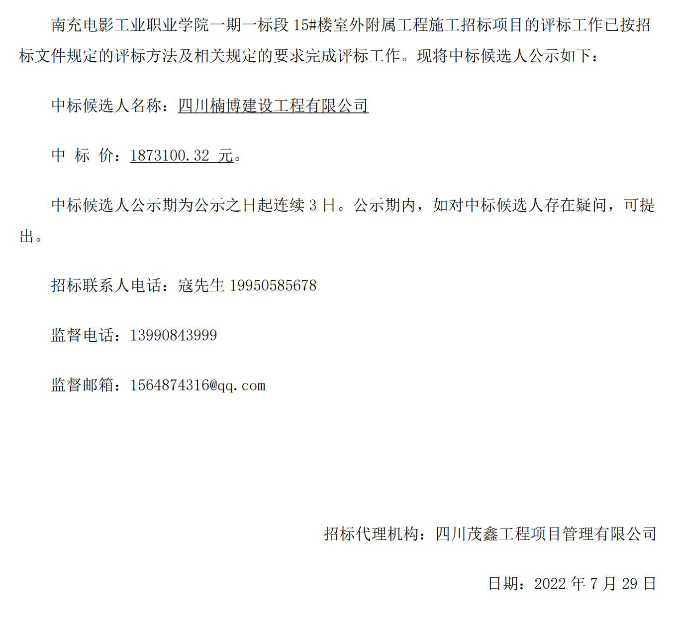 南充电影工业职业学院一期一标段15#楼室外附属工程中标公示