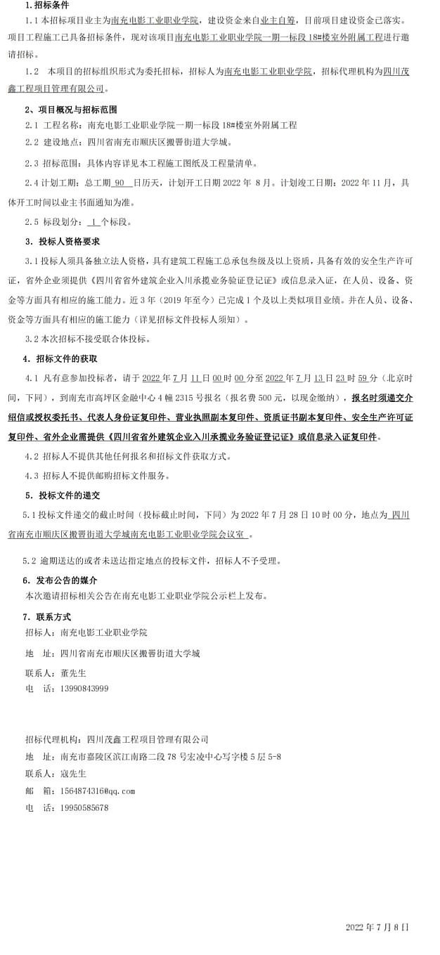 南充电影工业职业学院一期一标段18#楼室外附属工程施工招标公告