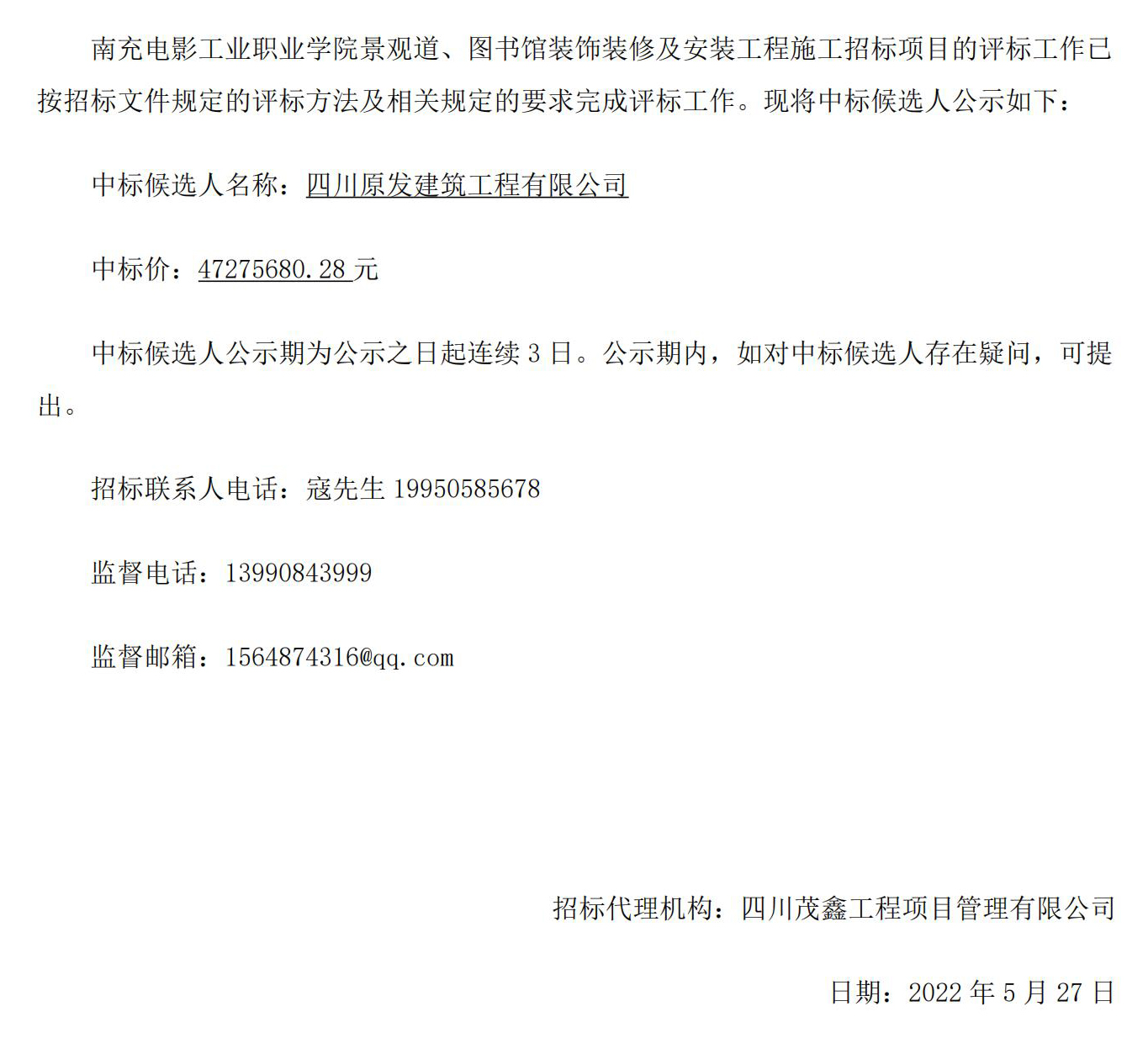 南充电影工业职业学院景观道、图书馆装饰装修及安装工程中标公示