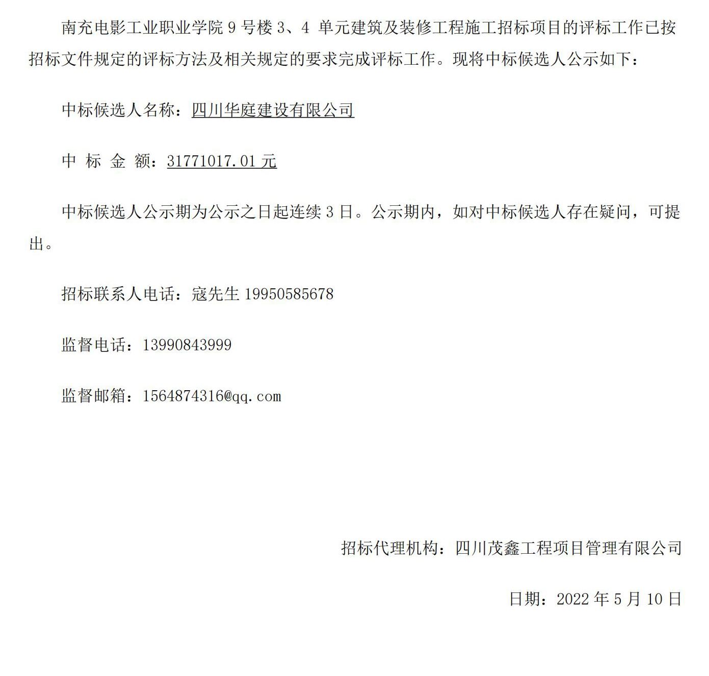 南充电影工业职业学院9号楼3、4 单元建筑及装修工程中标公示