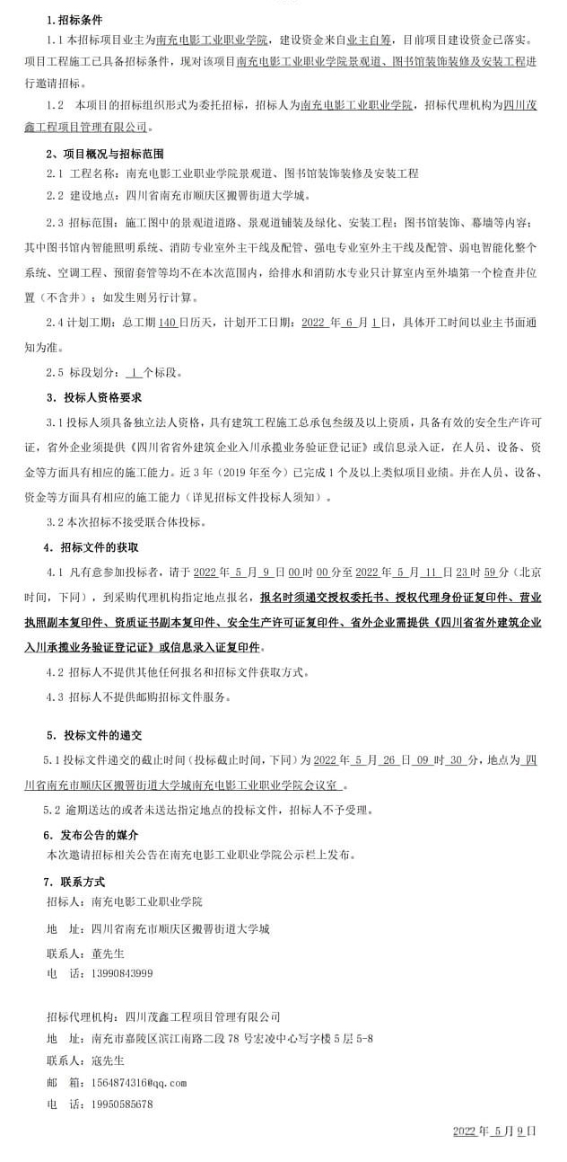 南充电影工业职业学院景观道、图书馆装饰装修及安装工程施工招标公告