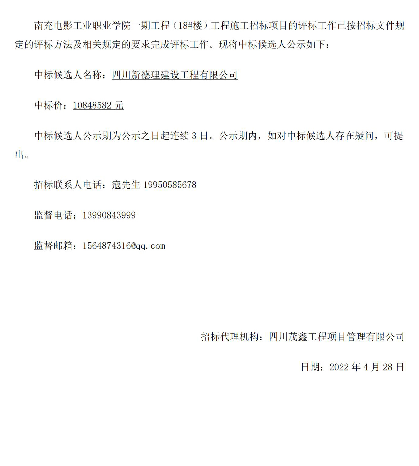 南充电影工业职业学院一期工程(18#楼)工程中标公示