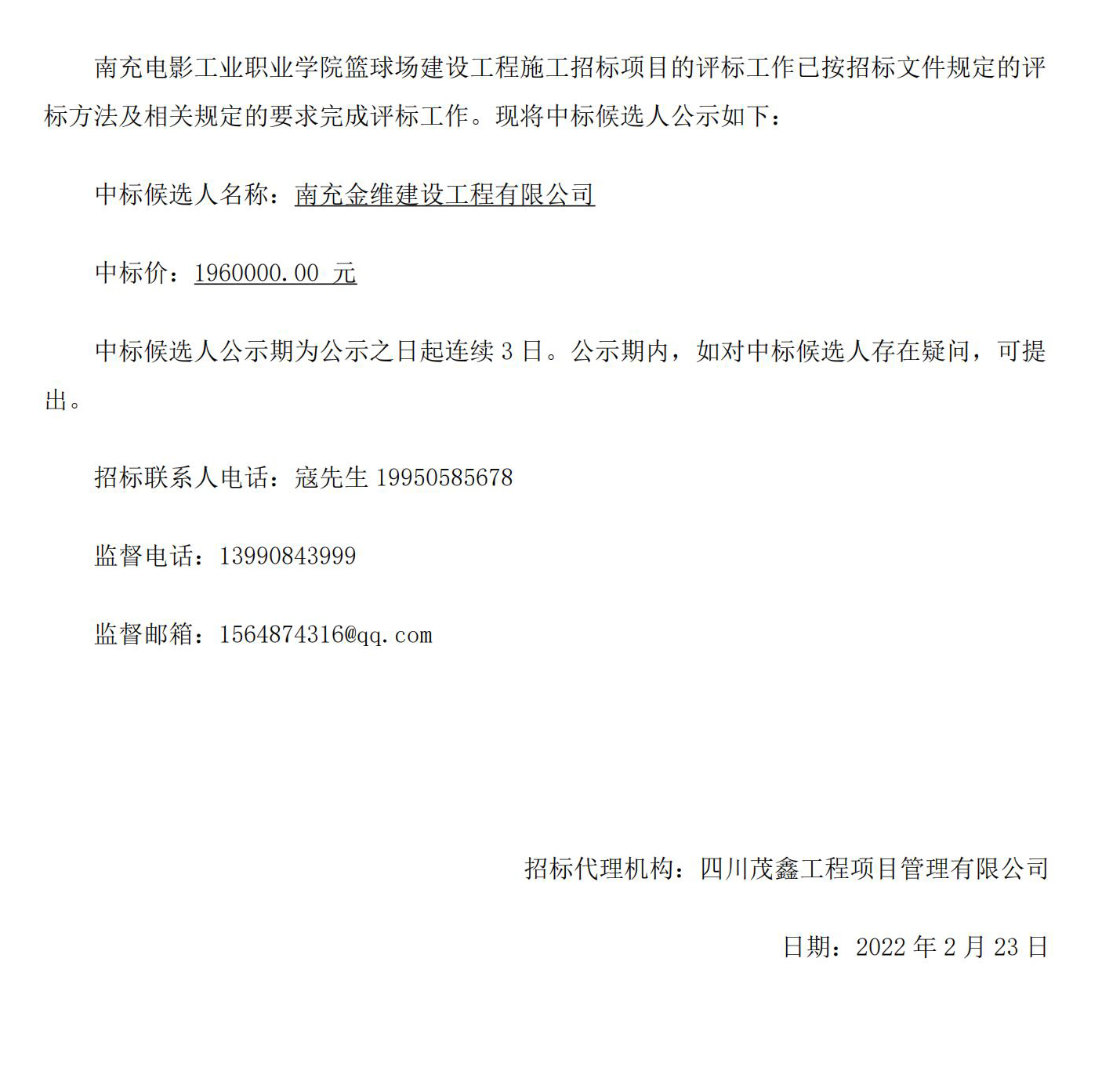 南充电影工业职业学院篮球场建设工程中标公示