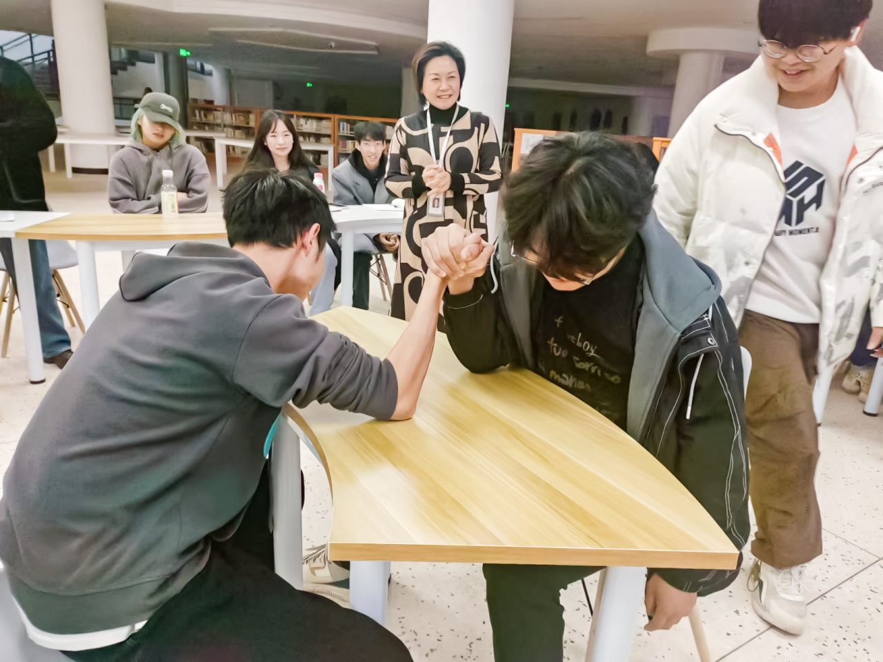 活动中,部分同学展示了精心准备的朗诵、唱歌、主题演讲等才艺,现场气氛活跃,其间的“扳手腕”游戏,把整个活动推向了高潮。