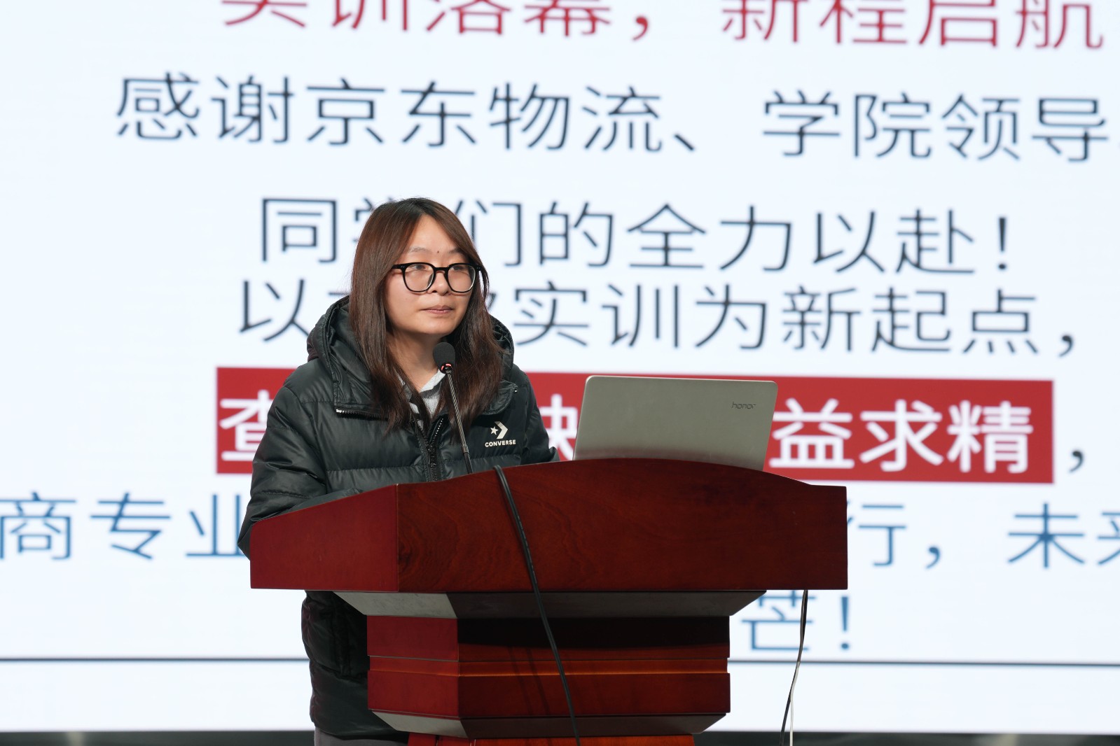 大会对近期京东实训中表现优异的师生进行了表彰。20名同学荣获“京东优秀实习生”称号,10名同学获评“京东卓越实习生”称号,6名教师被授予“京东优秀实习指导教师”称号。2024级电子商务专业张璟玥同学作为获奖学生代表,分享了在京东实习的感悟与成长;信息管理学院杨颖平老师作为教师代表,讲述了在产教融合实践中指导学生、教学相长的体会。