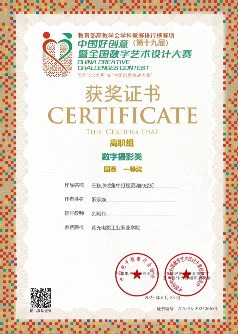 在第十九届中国好创意暨全国数字艺术设计大赛的数字摄影类赛道上,学生们在教师的指导下,深入生活挖掘素材。他们利用课余时间,走遍城市的大街小巷、乡村的田间地头,用镜头捕捉那些触动人心的瞬间。经过无数次的拍摄、筛选与后期制作,最终罗承焕同学凭借一组以城市为题材的摄影作品脱颖而出,荣获全国一等奖。在创作过程中,学生们不断接受教师的专业指导,从构图的精妙安排到色彩的细腻调整,每一个环节都精益求精。