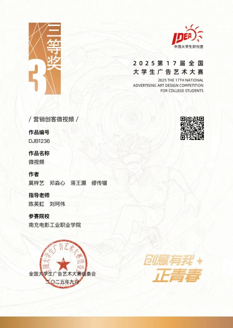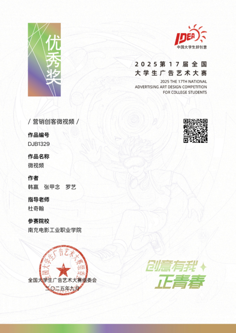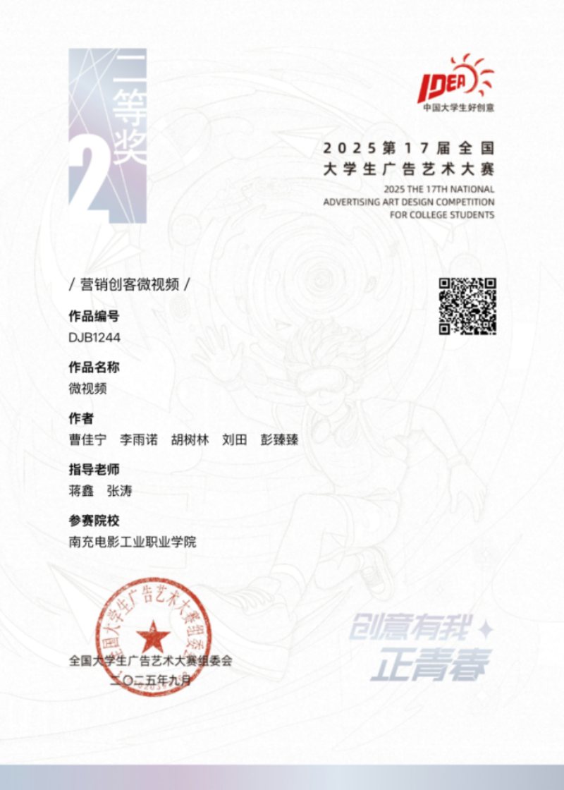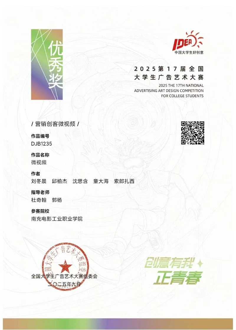 同样在第17届大学生广告艺术大赛的Jc营销创客微视频赛道上,学生们组成团队进行创作。教师引导学生关注当下热点消费趋势和年轻群体的喜好,鼓励他们大胆创新。学生们从策划创意脚本开始,就反复研讨、推翻重来,力求打造出最具吸引力的故事。在拍摄阶段,他们克服场地、设备等诸多困难,精心布置每一个场景,雕琢每一个镜头。最终,学生孙建昊和曹佳宁带领的团队斩获了全国二等奖,充分展现了学生们的创意和团队协作能力。