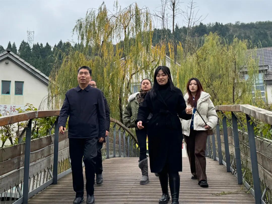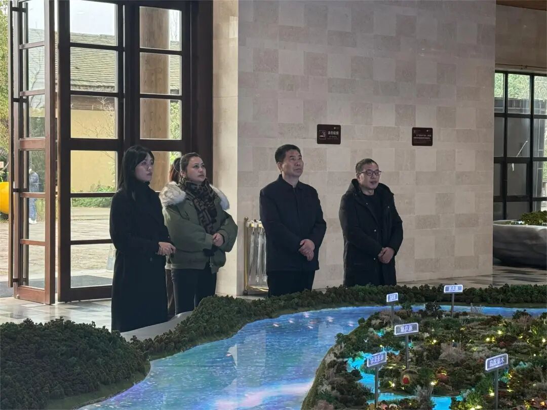 在正式洽谈前,凤仪湾景区方面特意安排学院一行实地参观了景区。在园区经理及相关工作人员的引领与讲解下,田建国院长一行深入走访了凤仪湾的核心景观区、特色建筑群落及重要设施。大家重点考察了水域景观、生态廊道、具有特色的民宿聚落以及备受关注的凤仪湾舞台等区域。沿途,录音专业主任李瑞婷、摄影摄像专业老师张成等从专业视角,对景区的环境声场、自然光线条件、场景构图潜力以及作为影视拍摄外景地的适配性进行了细致的现场评估与交流。通过实地走访,学院团队对凤仪湾丰富的自然人文景观、完善的配套设施以及潜在的多维度教学实践价值有了更为直观和深入的了解。