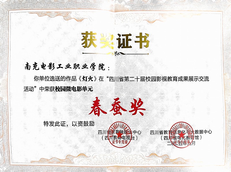 热烈祝贺我校选送的作品《灯火》在“四川省第二十届校园影视教育成果展示交流活动”中荣获校园微电影单元“春蚕奖”